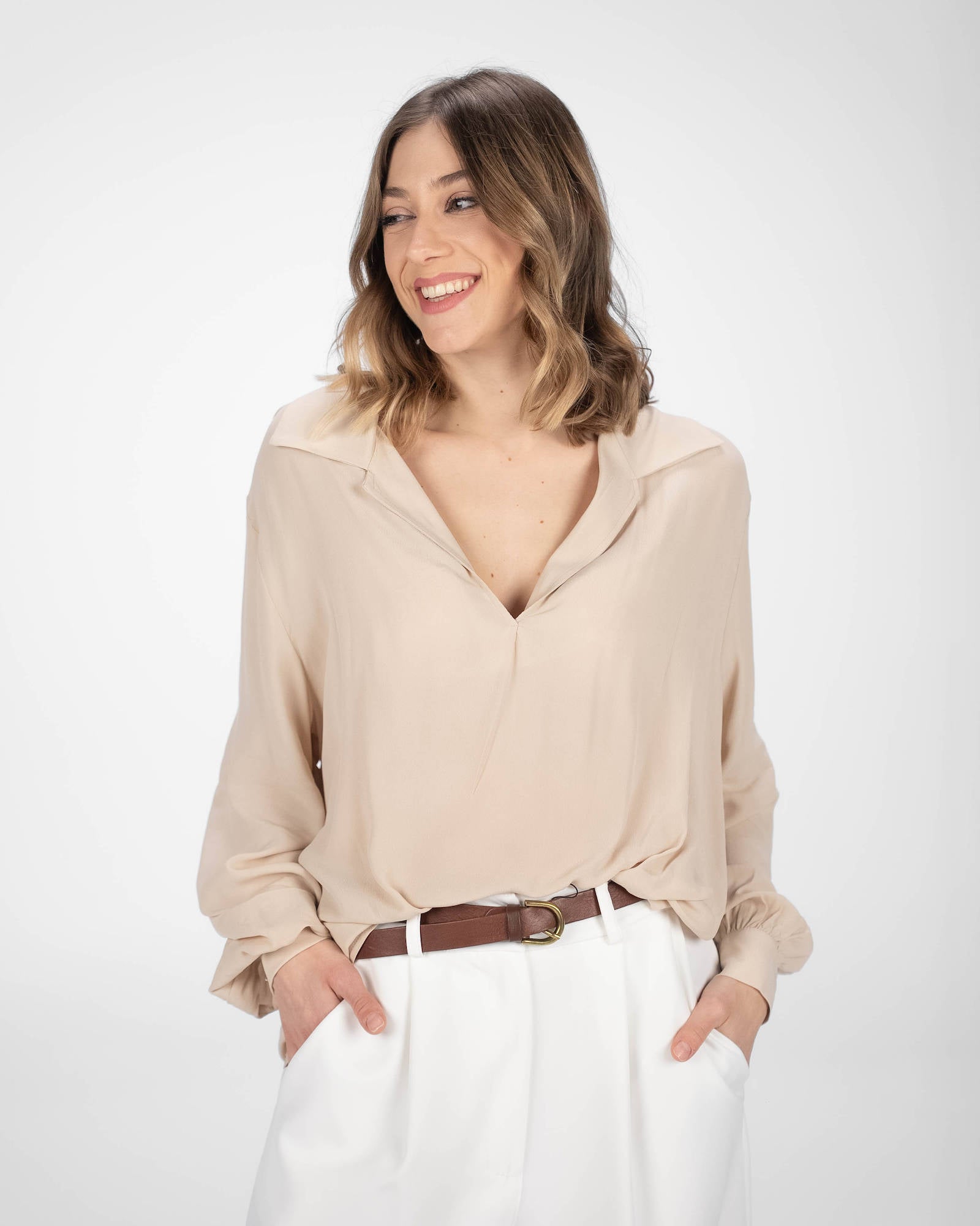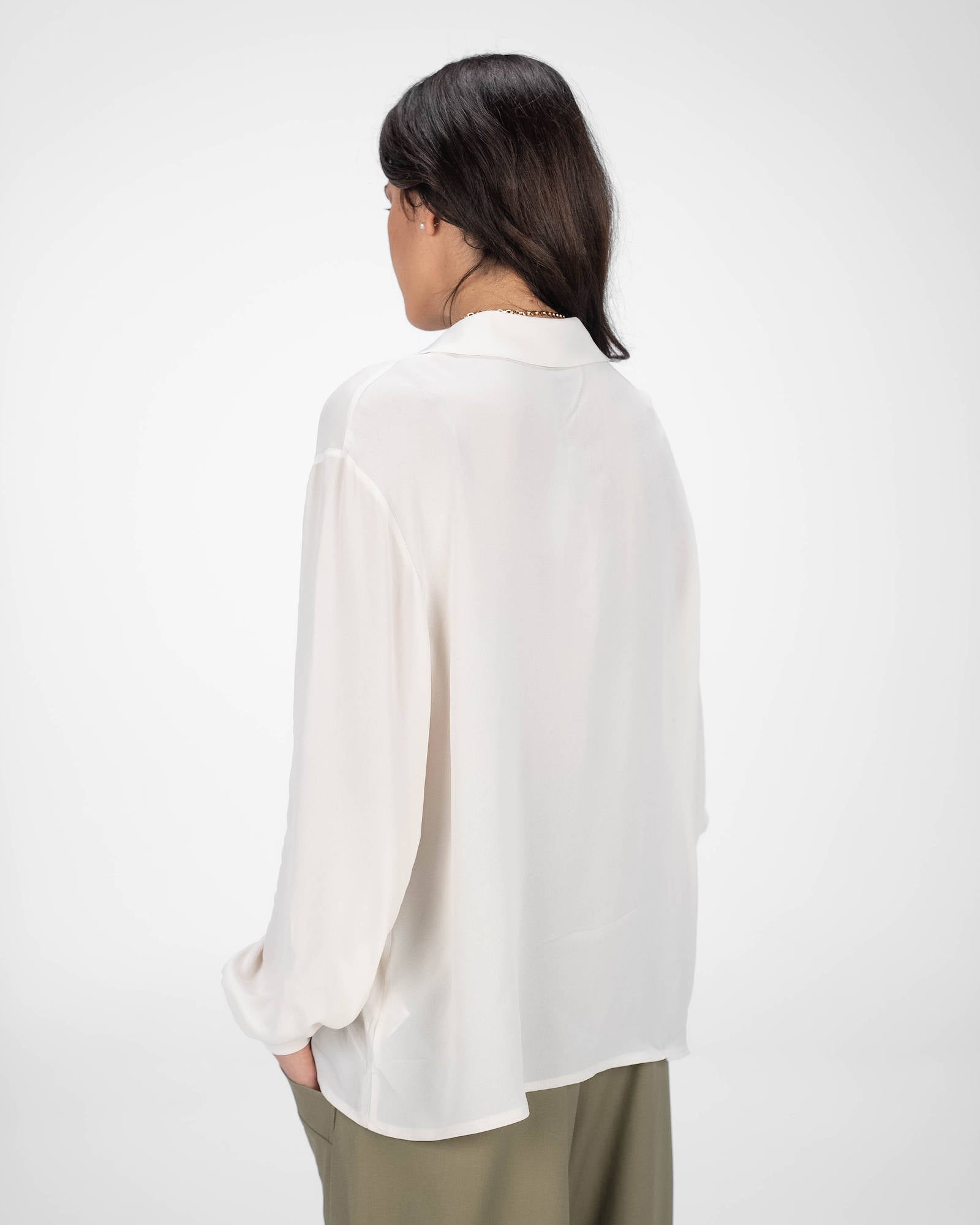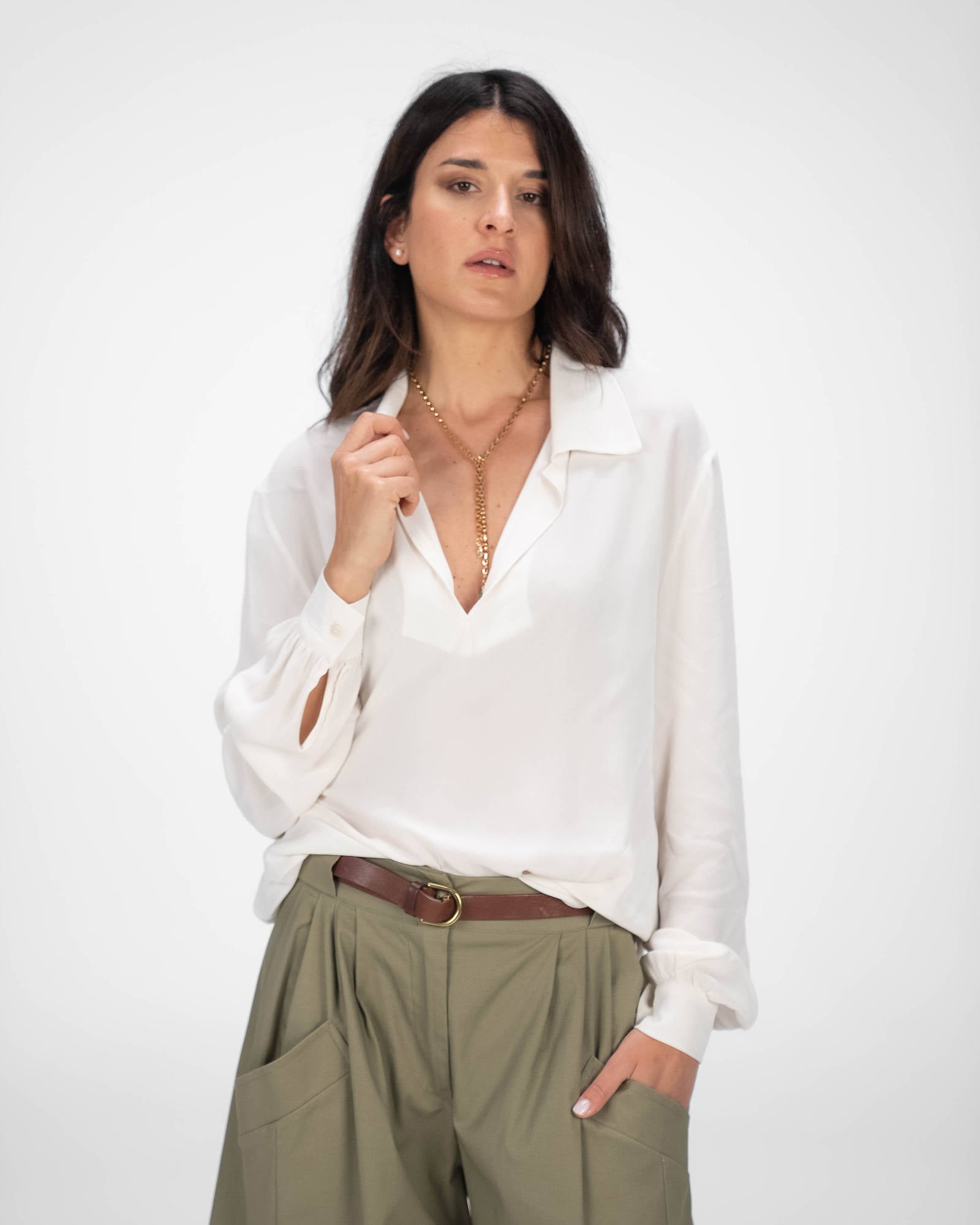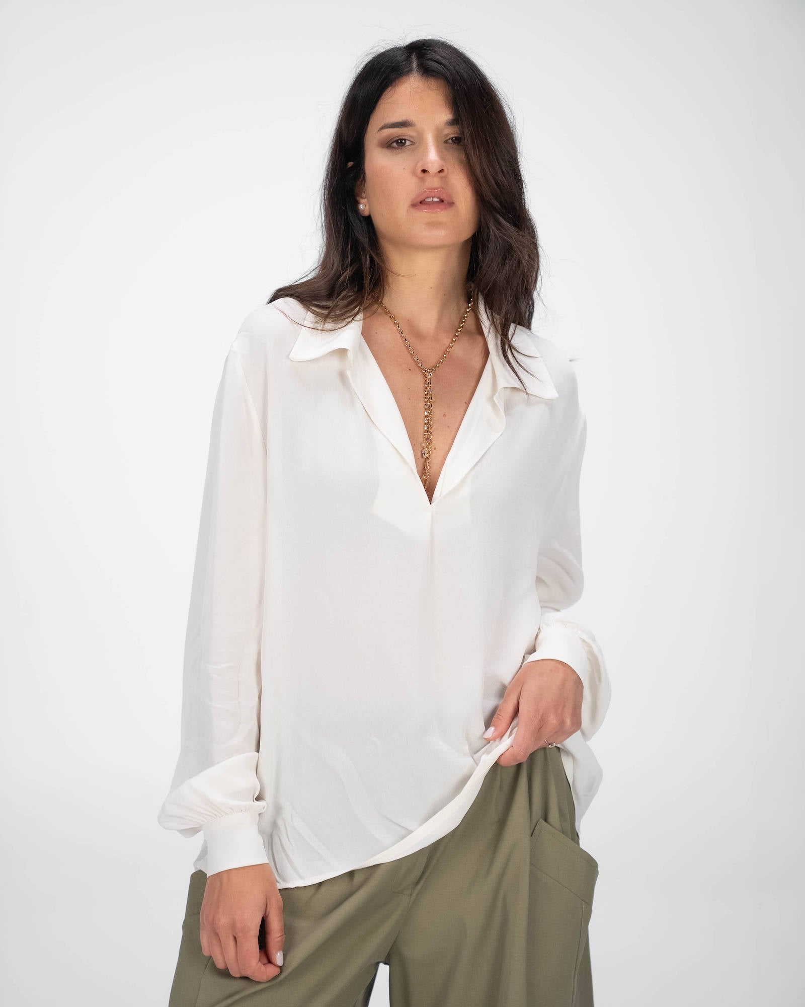 La camicia è uno dei capi più versatili del guardaroba femminile: si abbina a pantaloni, gonne e coordinati, si indossa sotto giacche e blazer e si adatta con facilità a contesti diversi. La collezione propone modelli che spaziano dalla camicia bianca donna — evergreen senza stagione — a versioni in tessuti più ricercati per look da ufficio o occasioni curate.
