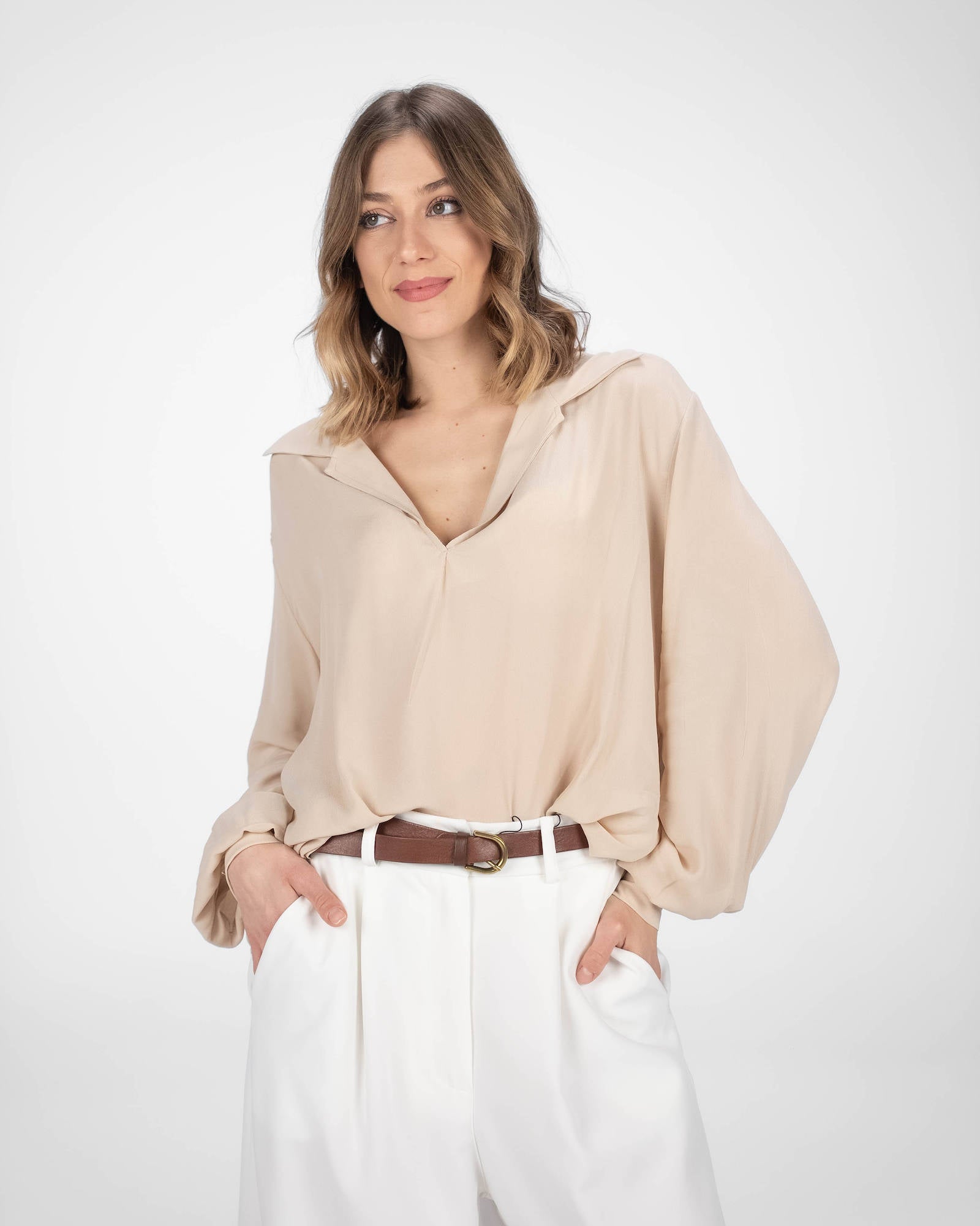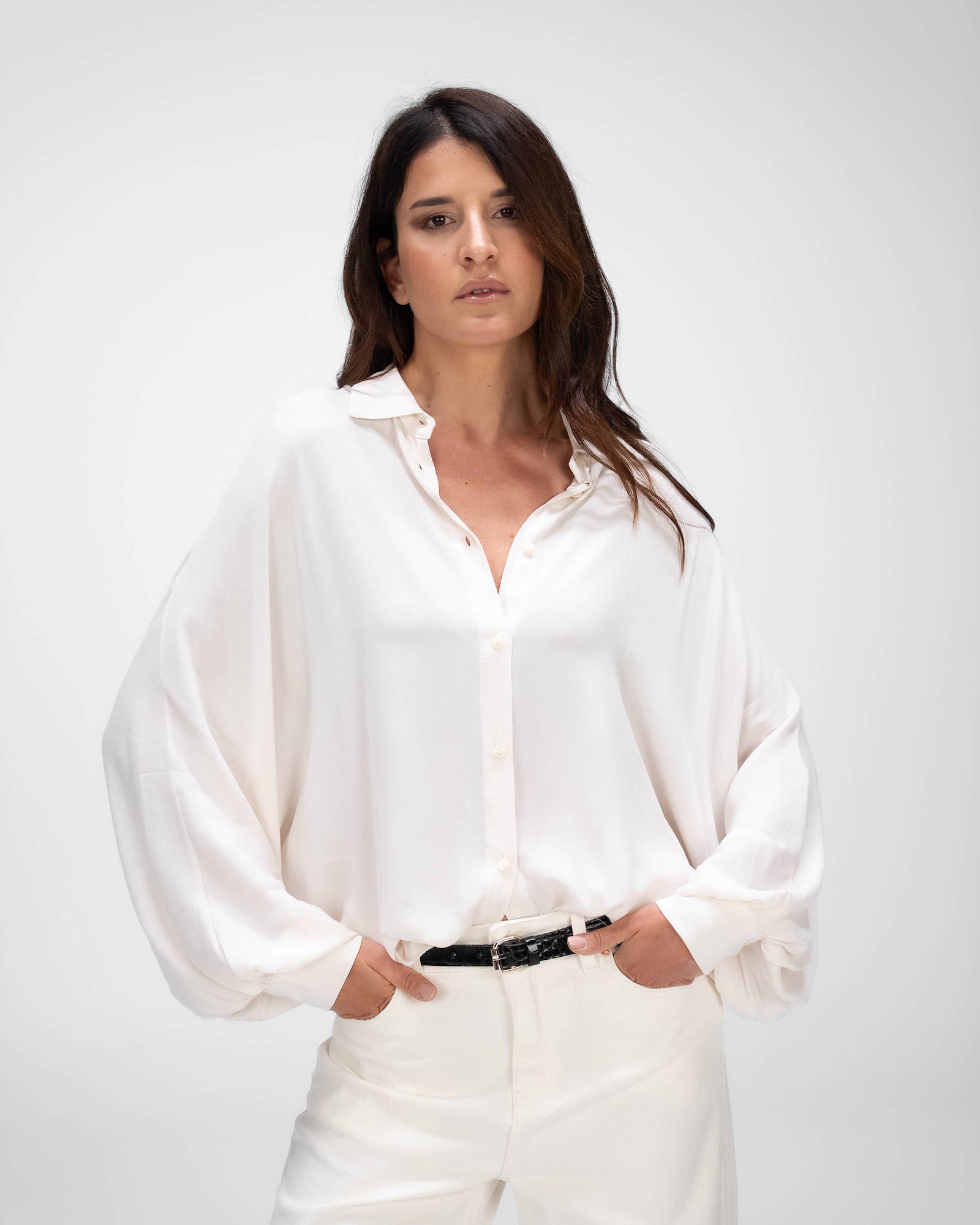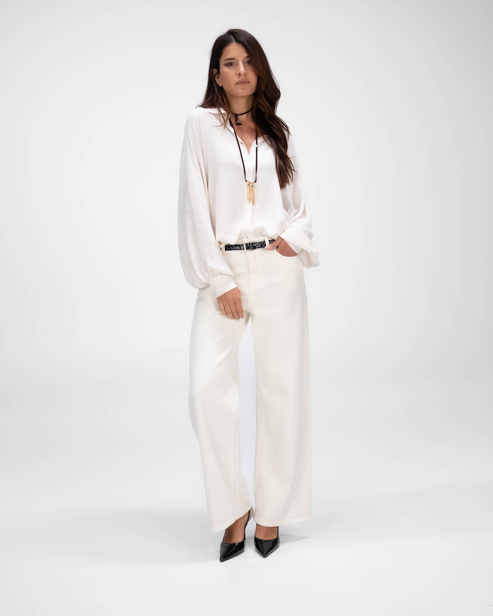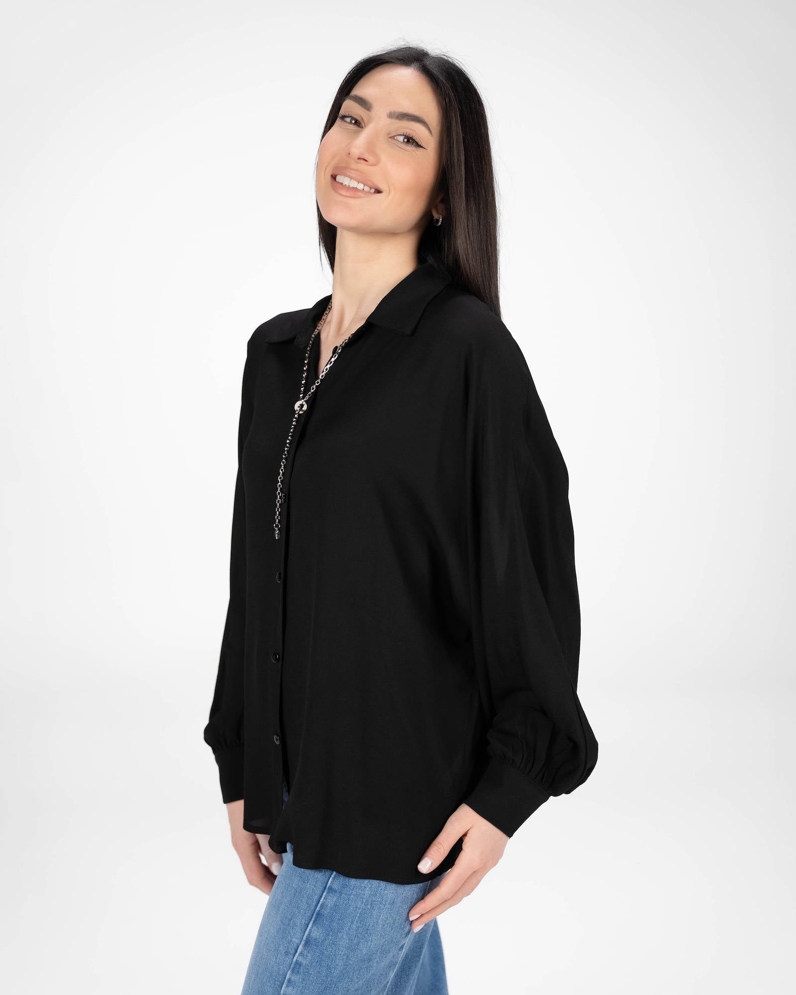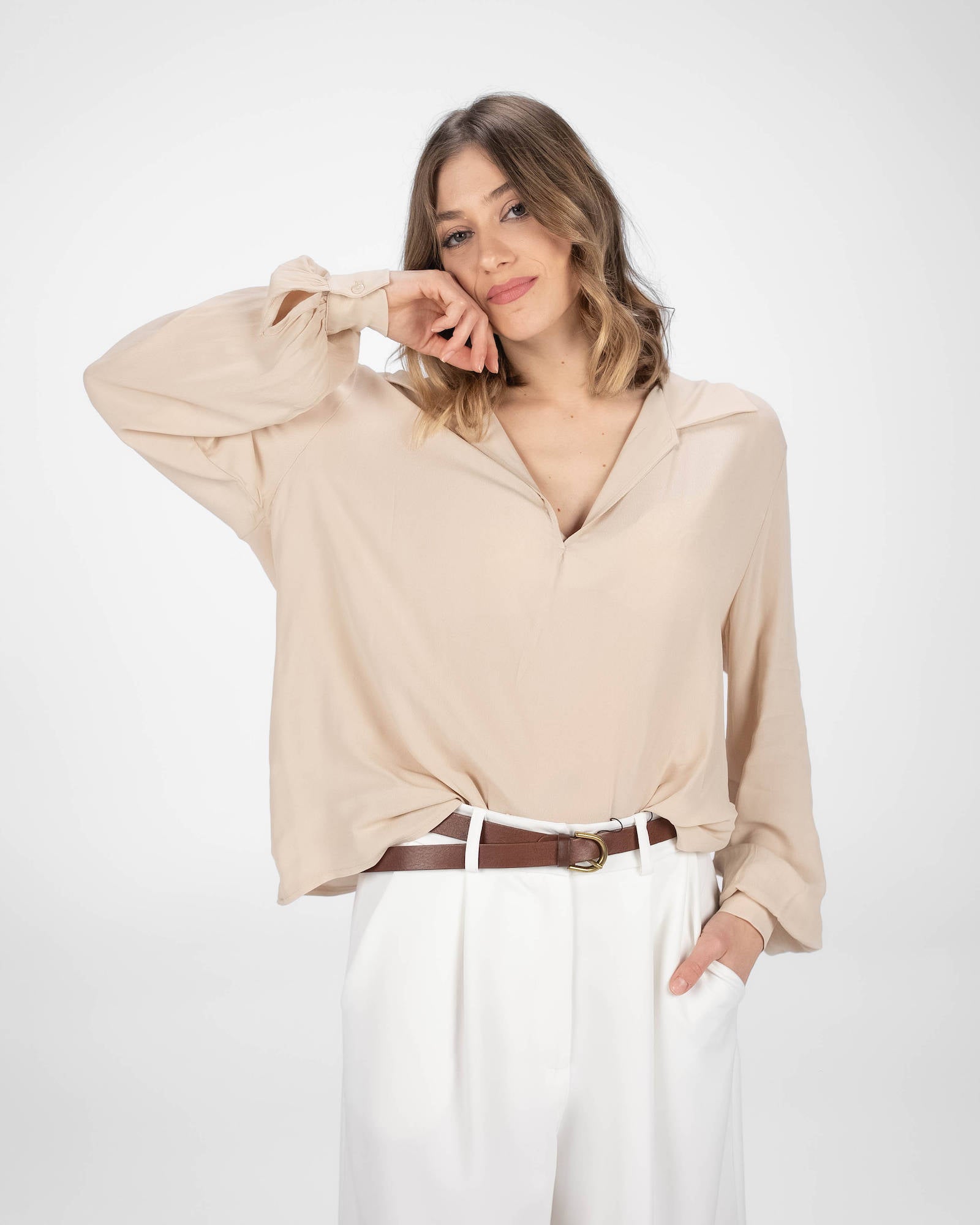 La camicia è uno dei capi più versatili del guardaroba femminile: si abbina a pantaloni, gonne e coordinati, si indossa sotto giacche e blazer e si adatta con facilità a contesti diversi. La collezione propone modelli che spaziano dalla camicia bianca donna — evergreen senza stagione — a versioni in tessuti più ricercati per look da ufficio o occasioni curate.