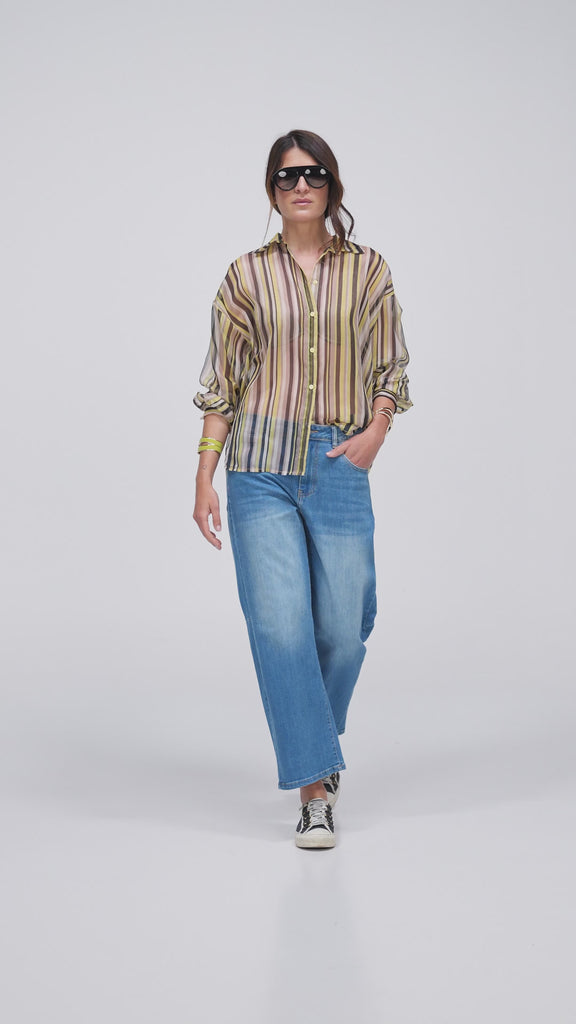 CAMICIA IN CHIFFON A RIGHE, PIU' LUNGA DIETRO, POLISINO CON BOTTONE, SPALLA SCESA. LEGGERA E VELATA. Prodotto Pslove Made in Italy