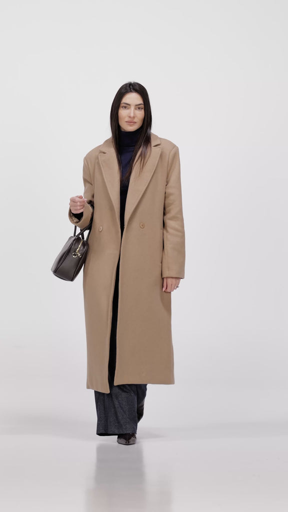 CAPPOTTO CLASSICO, ELEGANTE E FODERATO, SCOLLO A V CON REVERS, CHIUSURA DOPPIOPETTO CON BOTTONI IN TINTA. TASCHE A FILETTO. PARTICOLARE SOFFIETTO DIETRO E SPACCO ALTO.