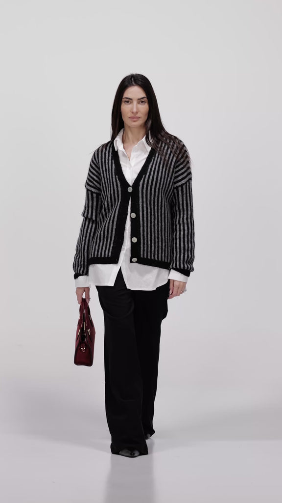 CARDIGAN SCOLLO A V CON BOTTONI IN MADREPERLA. VESTIBILITA' MORBIDA, SPALLA SCESA.
