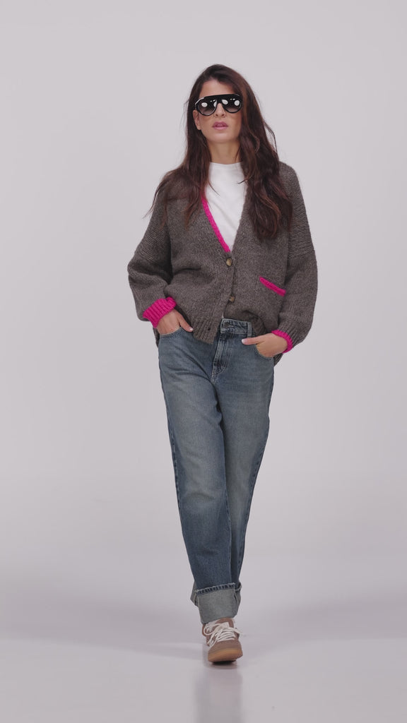 CARDIGAN IN MAGLIA SCOLLO A V, CHIUSO CON TRE BOTTONI, SPALLA MOLTO SCESA, TASCHE FRONTALI A VISTA, FINITURE A CONTRASTO.