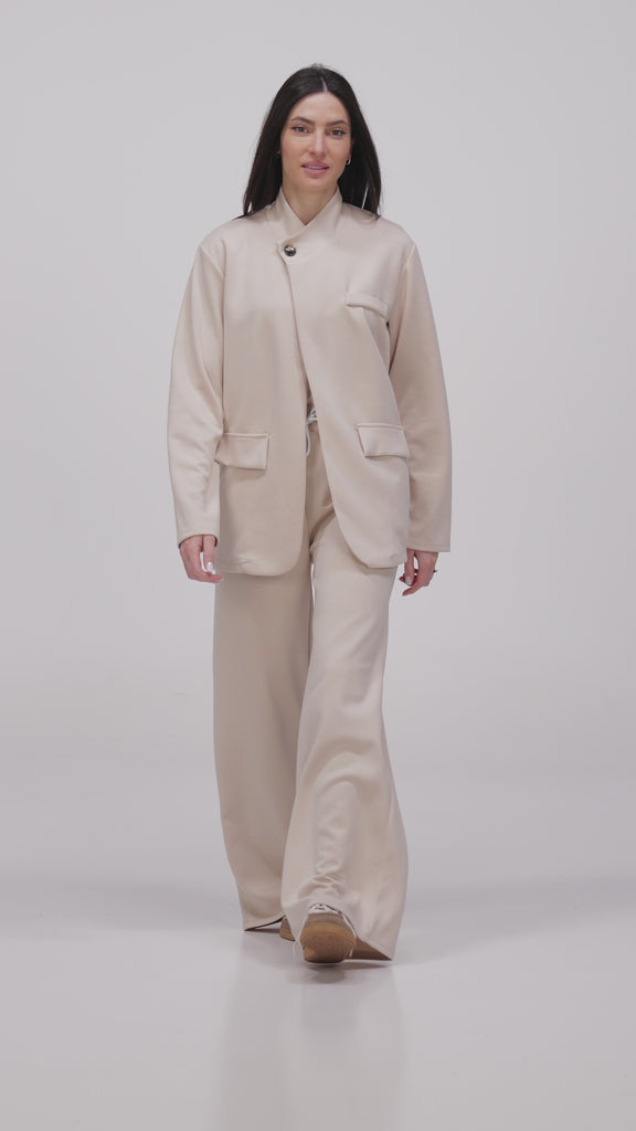 COMPLETO SPORTIVO CON GIACCA CHIUSURA ALTA A 1 BOTTONE LATERALE E PANTALONE PALAZZO CON ELASTICO IN VITA, COULISSE E TASCHE LATERALI.