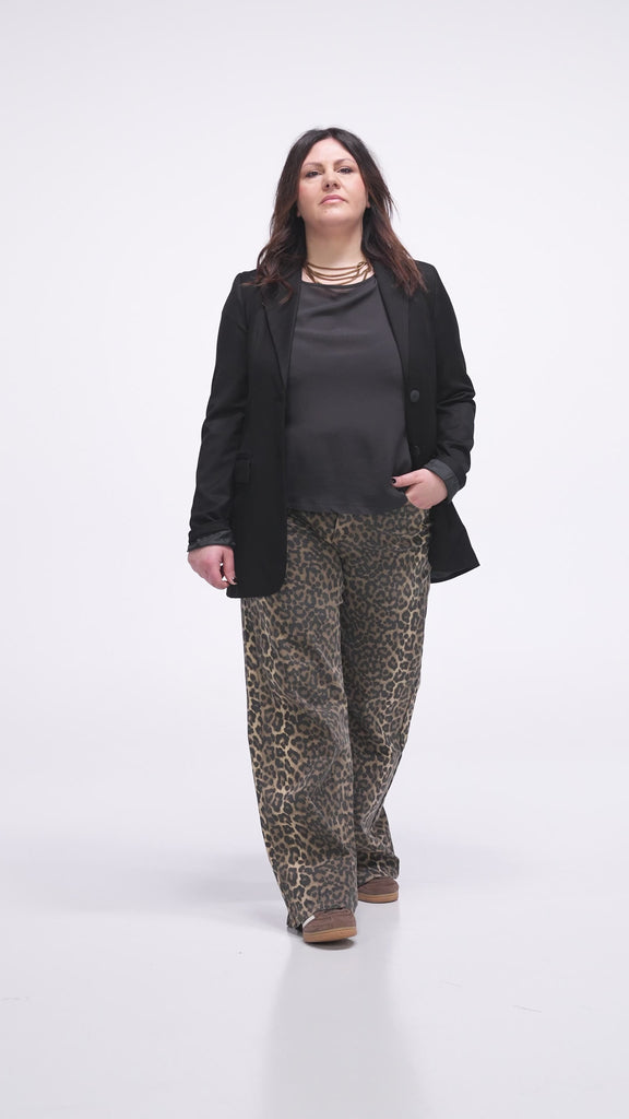 DENIM IN TESSUTO DI COTONE LEGGERO CON STAMPA MACULA. GAMBA AMPIA E DRITTA. Prodotto Selezionato Made in PRC