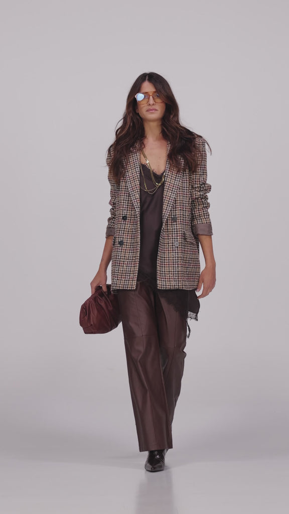 GIACCA CAPPOTTO OVER, DOPPIOPETTO FANTASIA CHECK CON SPALLINE, INTERNAMENTE FODERATA, REVER CLASSICO E TASCHE FRONTALI CON PATTA.