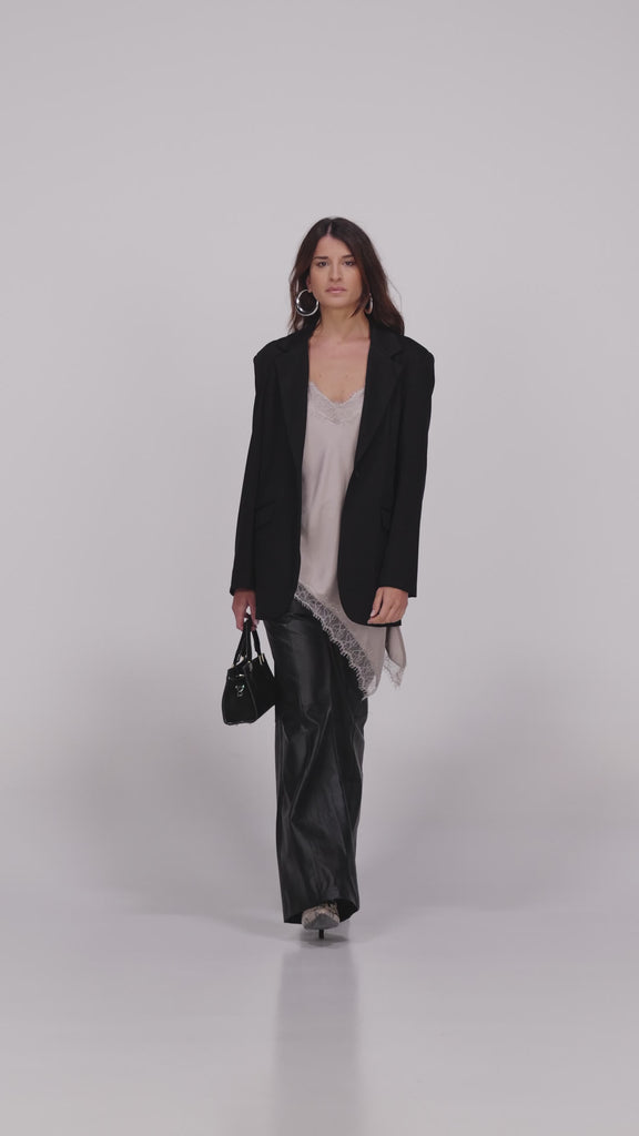 GIACCA OVER NERO MONOPETTO, TAGLIO DRITTO, TASCHE CON PATTA. UNA GIACCA PERFETTA PER TUTTI I LOOK, DAI PIU' AUDACI ALLO STREET STYLE.