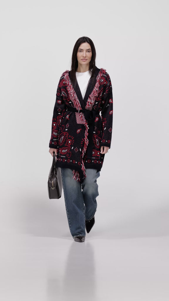KABAN IN MAGLIA CON FRANGE, LAVORAZIONE PAISLEY, CHIUSO CON CINTA.