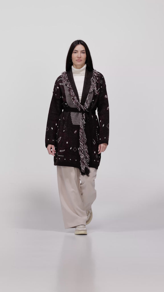 KABAN IN MAGLIA CON FRANGE, LAVORAZIONE PAISLEY, CHIUSO CON CINTA.