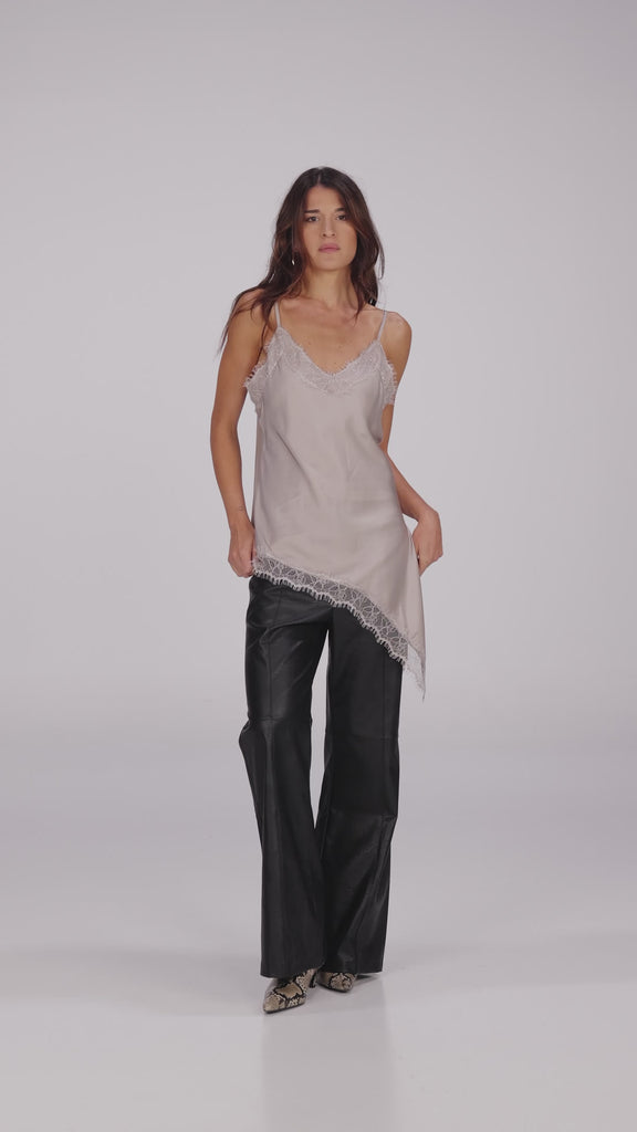 PANTALONE ECOPELLE, MODELLO SVASATO, CON CUCITURA DAVANTI. PUNTO VITA SENZA TASCHE, CHIUSURA CON ZIP.