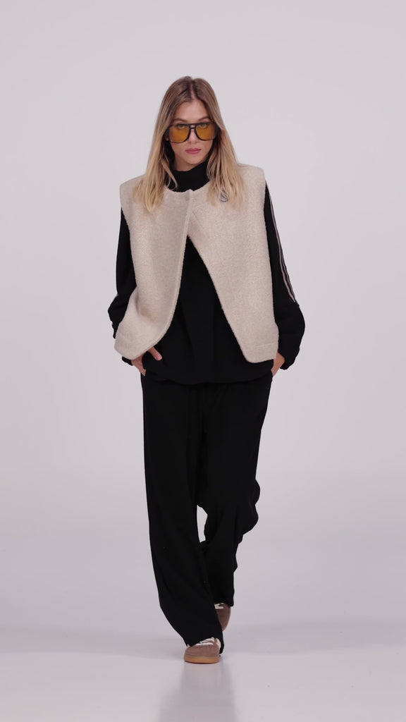 PANTALONE PALAZZO IN SPUGNA. SMOCK IN VITA CON COULISSE, TASCHE LATERALI. SI ABBINA PERFETTAMENTE AL PULL URBAN COZY
