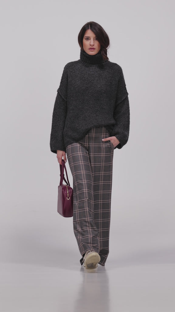 PANTALONE CHECK VITA MEDIA CON GAMBA AMPIA E DRITTA SENZA PINCES. TASCHE OBLIQUE, PASSANTI PER CINTURA. SMOCK NELLA PARTE POSTERIORE DEL PUNTO VITA. Prodotto selezionato Made in Italy