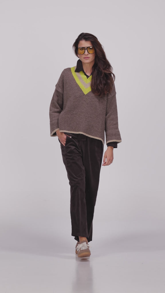 MAXI PULL SCOLLO A V, SPALLA SCESA, SPACCHI LATERALI, PIU' LUNGA DIETRO, FINITURE COLORI A CONTRASTO.