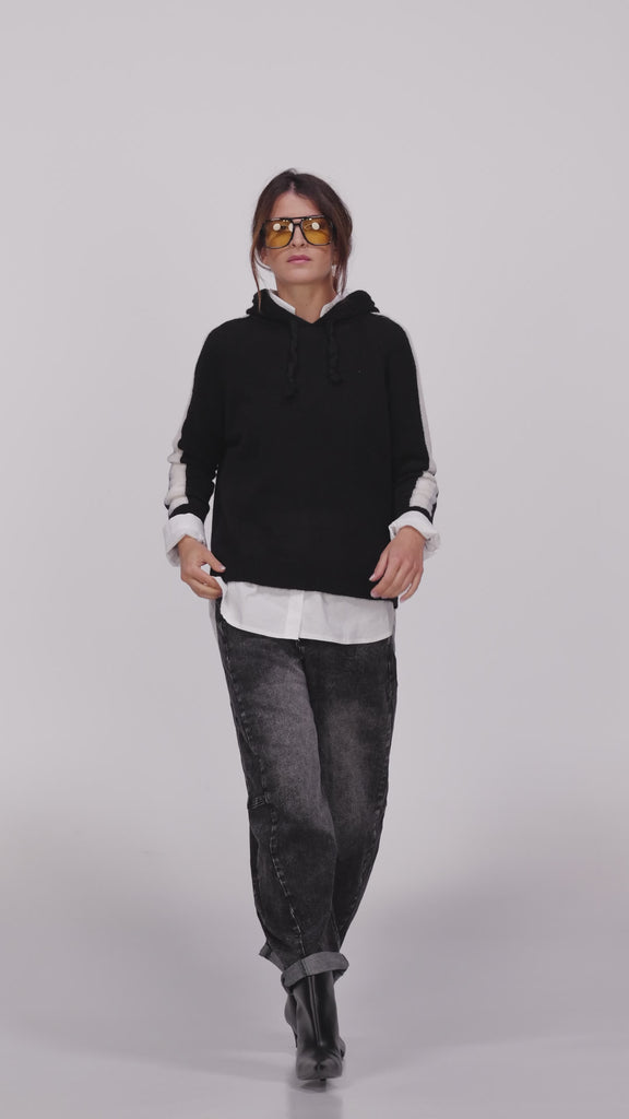 MORBIDO PULL CON MANICHE RAGLAN, CAPPUCCIO CON COULISSE, BANDE LATERALI A CONTRASTO SU MANICHE.