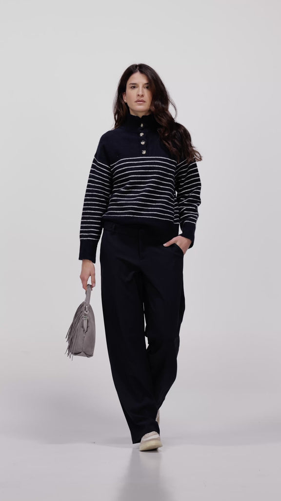 PULL IN MORBIDA MAGLIA, COLLO ALTO CON BOTTONI, COMBIANTA CON RIGHE A CONTRASTO.