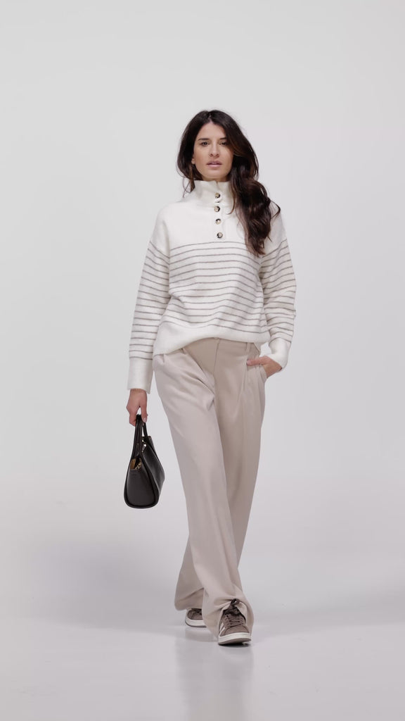 PULL IN MORBIDA MAGLIA, COLLO ALTO CON BOTTONI, COMBIANTA CON RIGHE A CONTRASTO.